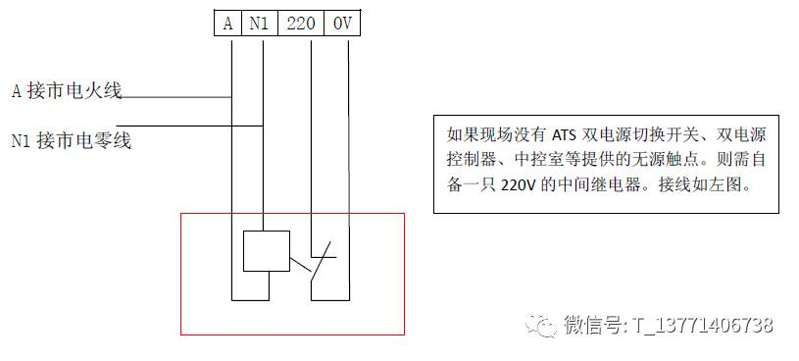 可能有的客戶系統比較簡單,沒有上面的說ATS雙電源電開,控制器這么高大上的玩意,只想接個市電電壓做個簡單檢測,請參考下圖,不過需要自已準備一個220V的繼電器,這種繼電器市場上就10來塊錢,一般市場上很好買的啦。